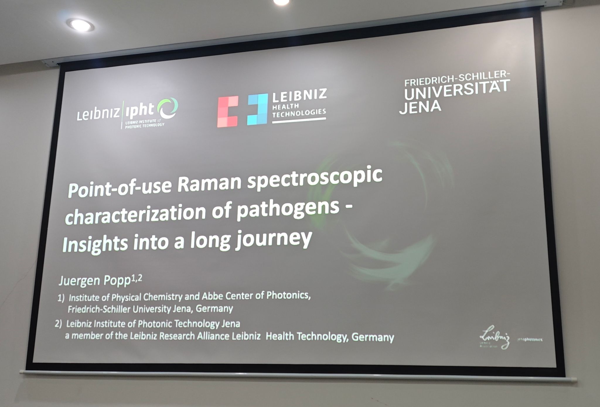 报告中,Jürgen Popp教授作题为“Point-of-use Raman spectroscopic characterization of pathogens-insights into a long journey”学术讲座,介绍了拉曼光谱在病原体现场检测应用方面的新方法与新技术。利用无标记显微拉曼光谱技术,进行单细胞(中性粒细胞)分析,获得病毒、细菌或真菌感染后中性粒细胞光谱信息。将拉曼光谱与机器学习相结合,用于不同病原体的精准筛查诊断,以解决临床病原微生物难以及时检测的挑战。在提问环节,Jürgen Popp教授就拉曼技术与人工智能相结合的应用前景与在场师生进行了深入交流。