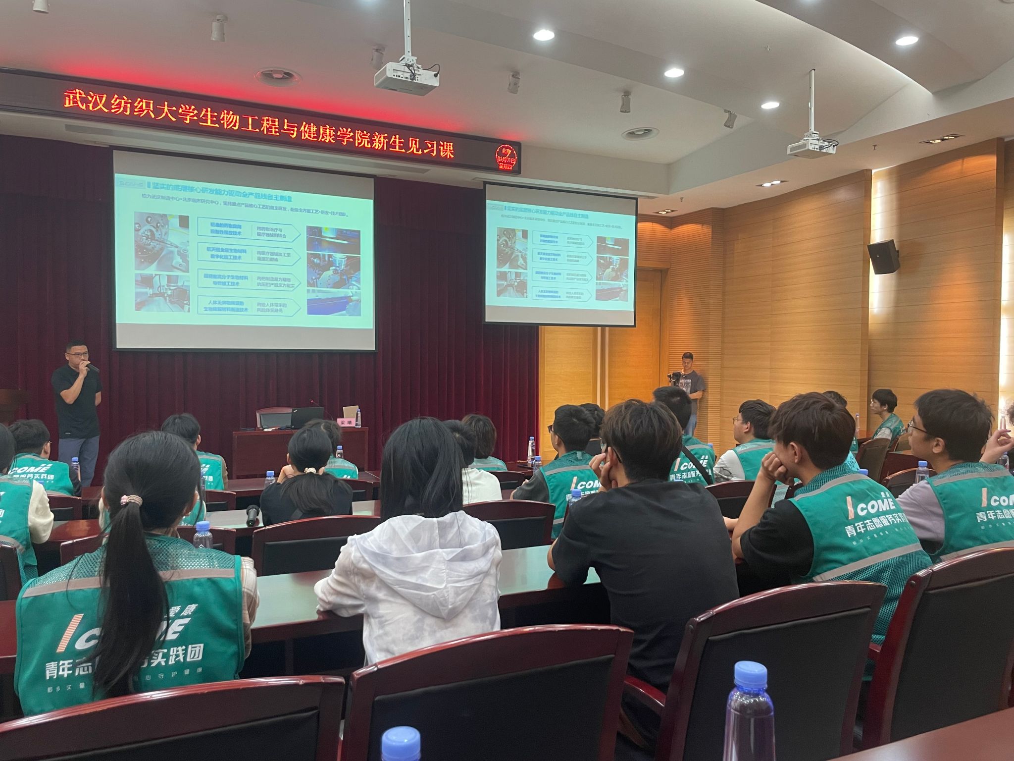 在学习交流环节,园区企业——柏为(武汉)医疗科技股份有限公司副总经理梁曦为员工们讲解了一场生动的“企业见习课”,同师生们一起分享和探讨了医疗器械行业的发展历程、当前挑战和未来趋势,并与员工们就如何将理论知识与实际工作相结合进行了深入的交流。